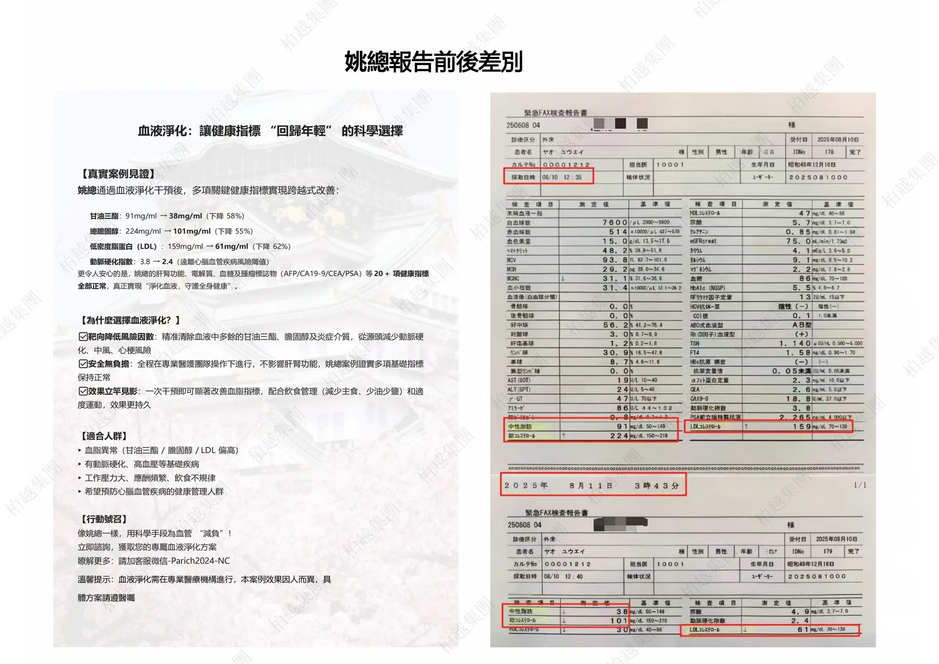 效果总结:单次血液净化 + 配套饮食调理,实现健康指标 “逆龄式” 改善,从 “高风险” 回归 “健康线”,真正做到 “净化血液,守护全身健康”。